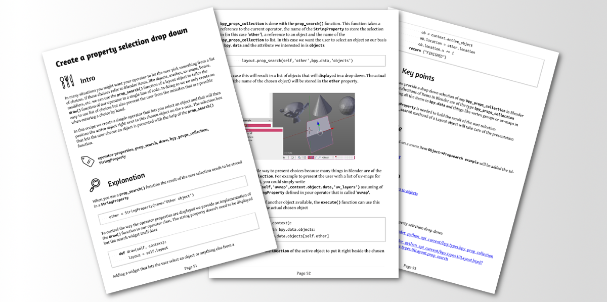 Each recipe also comes with links to relevant reference sites and Blender API sections, and each code snippet comes with a small example add-on that can be downloaded from GitHub so you can simply test the given examples and inspect them without the risk of typing errors.