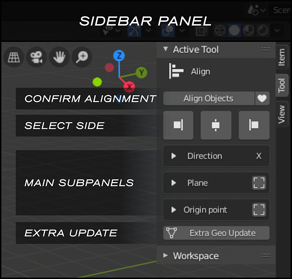 - Modifiers are now considered when calculating the alignment of objects. You may encounter some special cases when you need an extra update for a correct alignment (displacement texture changes, shape keys, drivers). In those cases, just click the Extra Geo Update in the Sidebar.