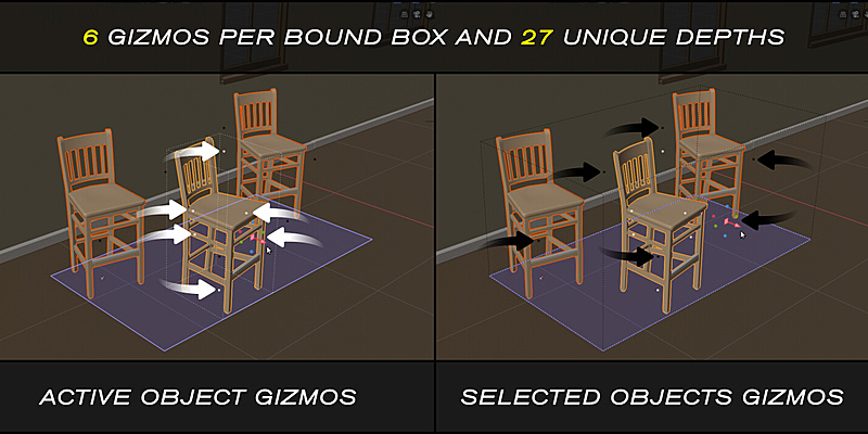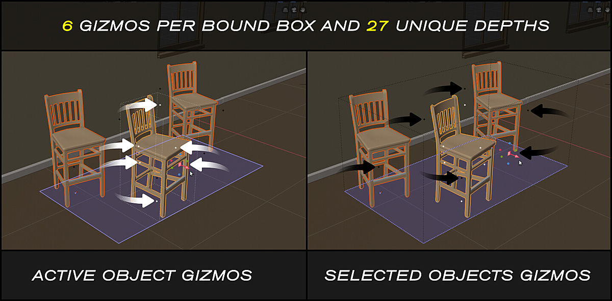 The Gizmos have different convenient base points, referring to the selected objects and the possible places at which the plane can be set.
