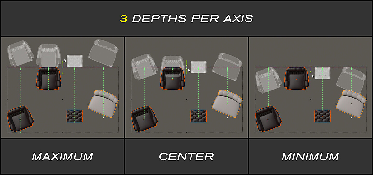 - Use Auto-alignments to select very fast a preset combination of origin points, projection plane and plane depth, all with the ease of a single click