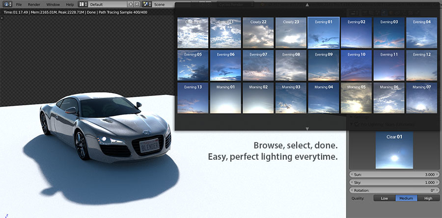 That’s Pro-Lighting: Skies: the fastest, easiest and most realistic outdoor lighting available for Blender. An all-in-one solution with: