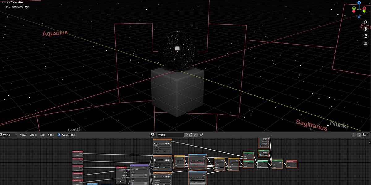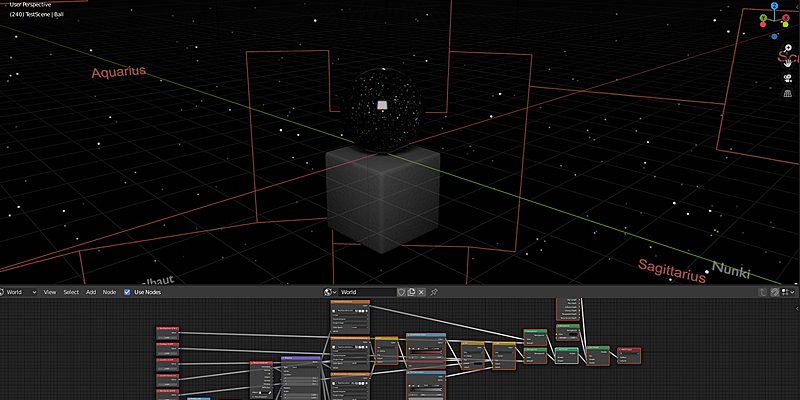 The screenshot below gives you an ideas of what you're getting. The column of Value nodes at the left offer a quick and easy way for switching options on and off and entering your latitude and time. The cluster of maths nodes at the bottom left to convert latitude and time into rotation for the mapping node. The Colour Ramp nodes near the centre control the colour of the constellation boundaries and star names text.