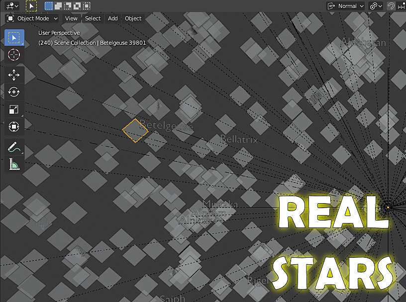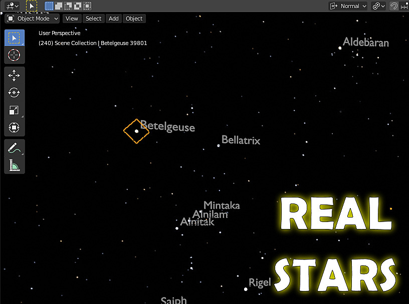 All the stars and star names can be rotated in unison to easily orient the starscape however you want. In the .blend file, this orientation is driven by a latitude property and from the timeline so that you can angle the stars based on any latitude on Earth. Then press play on the timeline to watch the stars wheel overhead as they do in real life.