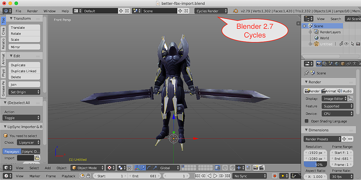 Here is an imported robot warrior in Cycles Renderer of Blender 2.79b, you may notice that his shield and weapon have already been attached to proper bones automatically, and all bones orientations have been corrected automatically, while the armature deform animation remains not changed.