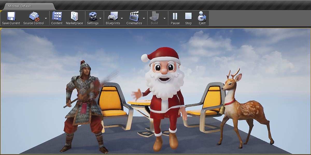 Here is one character in the Editor of Unreal Engine v4.22.3, the scene is the famous starter scene - 'Table, Glass And Chairs', note that Santa's eyes, mouth and face are driven by shape key animation, and his body is driven by armature deform animation.